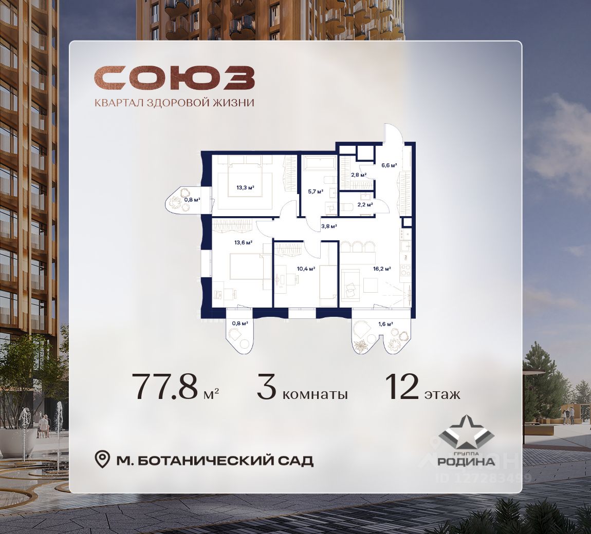 Продаётся 3-комнатная квартира площадью 77.8 м² на 12 этаже в Жилом Комплексе "Союз".