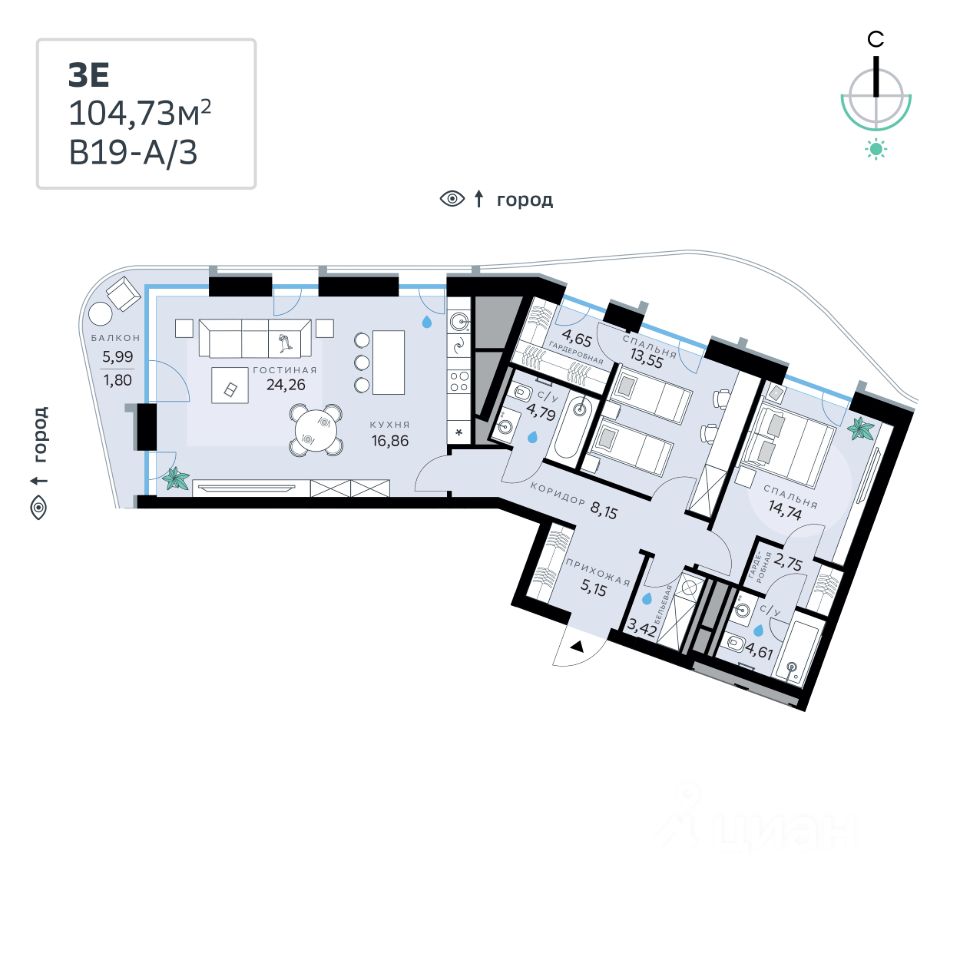 В продаже 3к квартира общей площадью 104,73 кв. м. Квартира расположена на 2 этаже 11-этажной секции корпуса Advanced в новом Рублёво-Архангельском районе Москвы, который строит Сбер. Дом находится на второй береговой линии Москвы-реки.