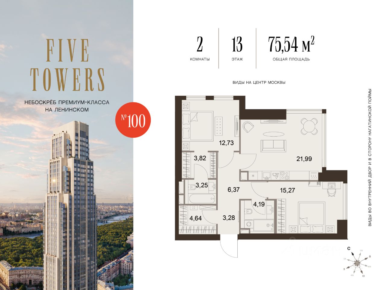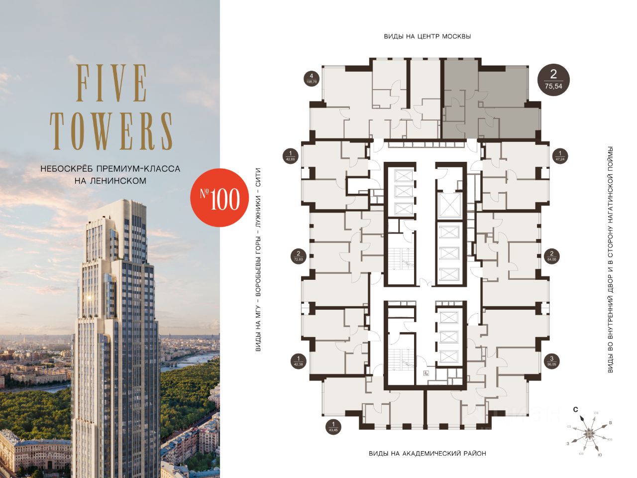 FIVE TOWERS — первый жилой небоскрёб на Ленинском проспекте и самый высокий дом столицы за пределами делового кластера "Москва-Сити". Премиальный небоскрёб представляет собой ультрасовременное, высокотехнологичное здание, идеальный синтез стилей культовых высоток Москвы и небоскребов Нью-Йорка и поражает воображение уникальными видами, монументальной роскошью и совершенством форм. Величественная панорама, открывающаяся из окон вашей квартиры, завораживает: легендарные сталинские высотки, шпиль главного корпуса МГУ, "Москва-Сити", спорткомплекс "Лужники".
