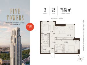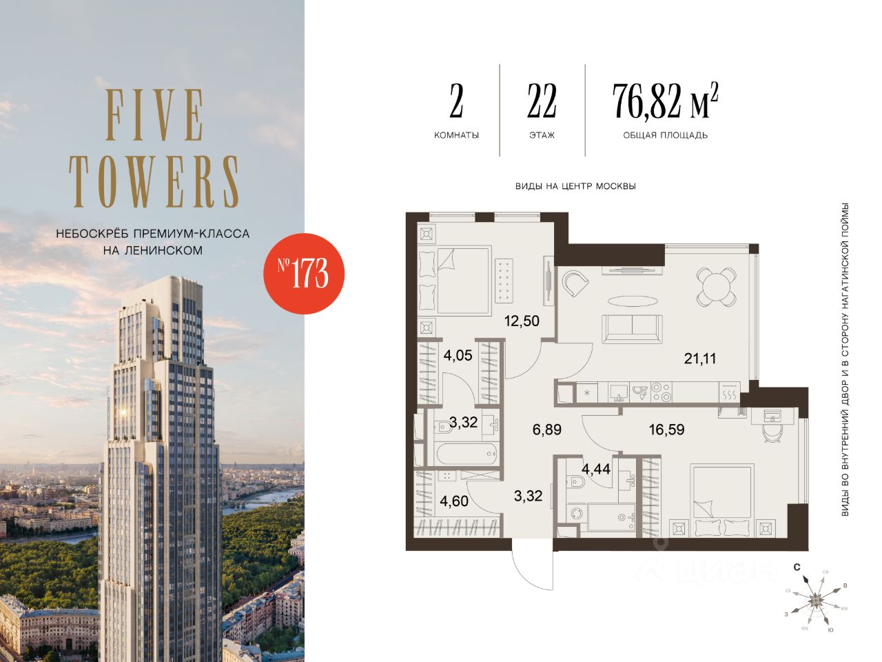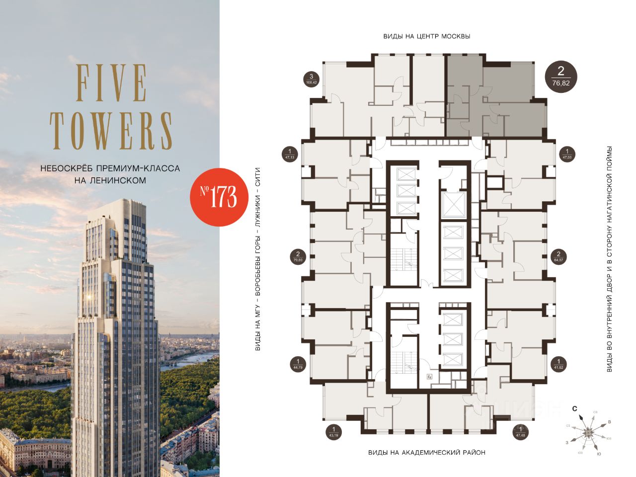 Гибкие программы рассрочки: 0% без переплат и удорожания; первый взнос от 10%. О проекте FIVE TOWERS — первый жилой небоскрёб на Ленинском проспекте и самый высокий дом столицы за пределами делового кластера "Москва-Сити". Премиальный небоскрёб представляет собой ультрасовременное, высокотехнологичное здание, идеальный синтез стилей культовых высоток Москвы и небоскребов Нью-Йорка и поражает воображение уникальными видами, монументальной роскошью и совершенством форм. Величественная панорама, открывающаяся из окон вашей квартиры, завораживает: легендарные сталинские высотки, шпиль главного корпуса МГУ, "Москва-Сити", спорткомплекс "Лужники". Окружение 75-этажный жилой комплекс премиум-класса расположен в историческом Донском районе. Транспортная инфраструктура проекта сделает жизнь резидентов FIVE TOWERS комфортной и продуманной: удобные выезды на ТТК и Садовое кольцо, 10 минут до метро "Ленинский проспект", 11 минут на МЦК до Москва-Сити. Рядом расположены крупные деловые и бизнес-центры, а в шаговой доступности — 500 га парков, образуемых Музеоном, Парком Горького и парком "Воробьевы горы". Инфраструктура Архитектурное бюро Олега Клодта разработало дизайн общественных пространств FIVE TOWERS: гранд-лобби, камерную библиотеку c камином и лифтовую зону. Все необходимые сервисы сосредоточены на первых этажах небоскрёба: кафе, винотека, салон красоты, фитнес и детский клуб. Приватный Sky Club 49 — респектабельный лаундж с открытой террасой и ограниченным доступом на 49 этаже — только для резидентов. Квартиры в FIVE TOWERS Все квартиры в FIVE TOWERS будут сданы с предчистовой отделкой (white box). Это позволит будущим резидентам комплекса сосредоточиться на творческой части ремонта, не связанной с организацией черновых работ. В жилом небоскребе FIVE TOWERS запланировано 596 премиальных квартир и 87 типов планировочных решений, которые можно адаптировать под личные запросы и сценарии проживания. В комплексе премиум-класса представлены не только двух- и трехкомнатные квартиры с угловым остеклением, но и однокомнатные с видом на две стороны и трехкомнатные квартиры с видами на три стороны, что является редким предложением на рынке недвижимости.