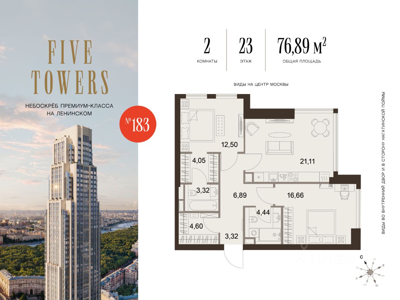 FIVE TOWERS — первый жилой небоскрёб на Ленинском проспекте и самый высокий дом столицы за пределами делового кластера "Москва-Сити". Премиальный небоскрёб представляет собой ультрасовременное, высокотехнологичное здание, идеальный синтез стилей культовых высоток Москвы и небоскребов Нью-Йорка и поражает воображение уникальными видами, монументальной роскошью и совершенством форм. Величественная панорама, открывающаяся из окон вашей квартиры, завораживает: легендарные сталинские высотки, шпиль главного корпуса МГУ, "Москва-Сити", спорткомплекс "Лужники".