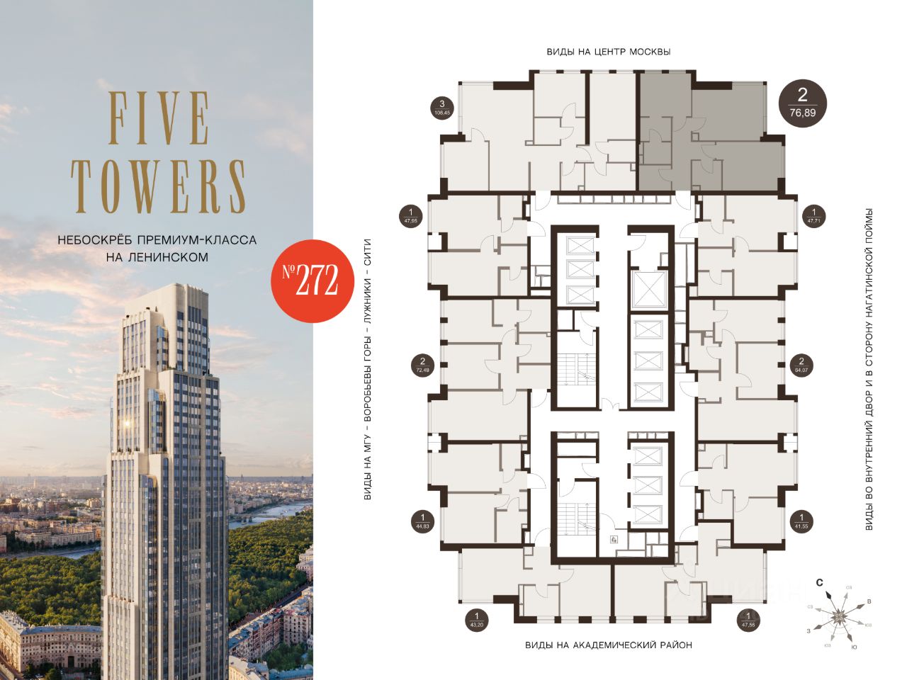 FIVE TOWERS — первый жилой небоскрёб на Ленинском проспекте и самый высокий дом столицы за пределами делового кластера "Москва-Сити". Премиальный небоскрёб представляет собой ультрасовременное, высокотехнологичное здание, идеальный синтез стилей культовых высоток Москвы и небоскребов Нью-Йорка и поражает воображение уникальными видами, монументальной роскошью и совершенством форм. Величественная панорама, открывающаяся из окон вашей квартиры, завораживает: легендарные сталинские высотки, шпиль главного корпуса МГУ, "Москва-Сити", спорткомплекс "Лужники".