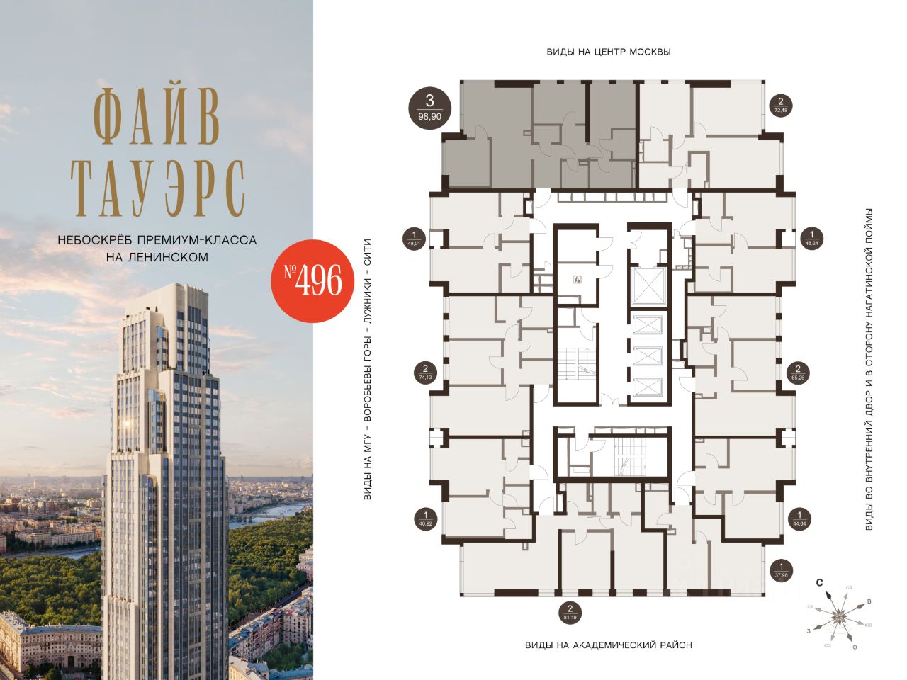 Гибкие программы рассрочки: 0% без переплат и удорожания; первый взнос от 10%. О проекте ФАЙВ ТАУЭРС — первый жилой небоскрёб на Ленинском проспекте и самый высокий дом столицы за пределами делового кластера "Москва-Сити". Премиальный небоскрёб представляет собой ультрасовременное, высокотехнологичное здание, идеальный синтез стилей культовых высоток Москвы и небоскребов Нью-Йорка и поражает воображение уникальными видами, монументальной роскошью и совершенством форм. Величественная панорама, открывающаяся из окон вашей квартиры, завораживает: легендарные сталинские высотки, шпиль главного корпуса МГУ, "Москва-Сити", спорткомплекс "Лужники". Окружение 75-этажный жилой комплекс премиум-класса расположен в историческом Донском районе. Транспортная инфраструктура проекта сделает жизнь резидентов ФАЙВ ТАУЭРС комфортной и продуманной: удобные выезды на ТТК и Садовое кольцо, 10 минут до метро "Ленинский проспект", 11 минут на МЦК до Москва-Сити. Рядом расположены крупные деловые и бизнес-центры, а в шаговой доступности — 500 га парков, образуемых Музеоном, Парком Горького и парком "Воробьевы горы". Инфраструктура Архитектурное бюро Олега Клодта разработало дизайн общественных пространств ФАЙВ ТАУЭРС: гранд-лобби, камерную библиотеку c камином и лифтовую зону. Все необходимые сервисы сосредоточены на первых этажах небоскрёба: кафе, винотека, салон красоты, фитнес и детский клуб. Приватный Sky Club 49 — респектабельный лаундж с открытой террасой и ограниченным доступом на 49 этаже — только для резидентов. Квартиры в ФАЙВ ТАУЭРС Все квартиры в ФАЙВ ТАУЭРС будут сданы с предчистовой отделкой (white box). Это позволит будущим резидентам комплекса сосредоточиться на творческой части ремонта, не связанной с организацией черновых работ. В жилом небоскребе ФАЙВ ТАУЭРС запланировано 596 премиальных квартир и 87 типов планировочных решений, которые можно адаптировать под личные запросы и сценарии проживания. В комплексе премиум-класса представлены не только двух- и трехкомнатные квартиры с угловым остеклением, но и однокомнатные с видом на две стороны и трехкомнатные квартиры с видами на три стороны, что является редким предложением на рынке недвижимости.