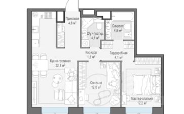 Квартира со свободной планировкой, которая предполагает создание кухни-гостиной, две изолированных спальни, гардеробную, два санузла, холл.