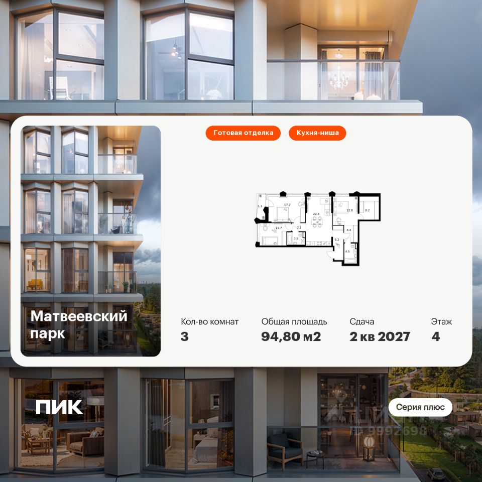 Продаётся 3-комн. квартира площадью 94,8 кв.м на 4 этаже 31 этажного дома (Корпус 4.3, Секция 3) проекта ПИК Матвеевский парк. Светлый просторный подъезд на уровне земли, функциональная планировка, большие окна, c отделкой.
