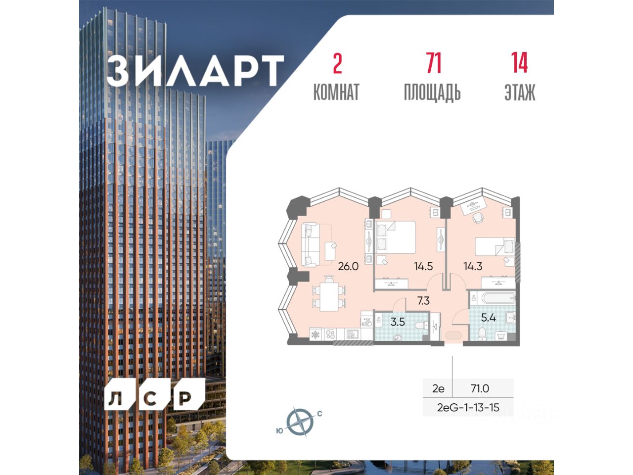 Продаётся 2-комнатная квартира в доме ЗИЛАРТ СПАРК общей площадью 71 кв. метров на 14 этаже.