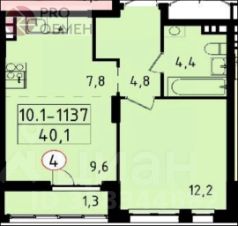 Oбщая площaдь квapтиpы — 40,1 кв. м., этаж 6 из 7, ceкция 15