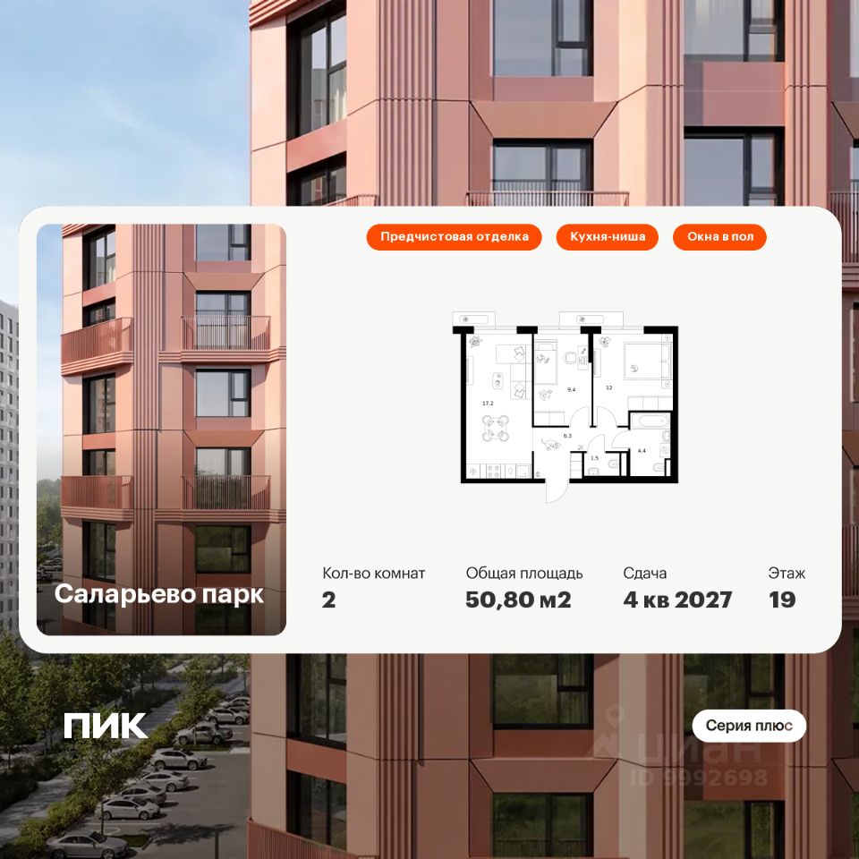 Продаётся 2-комн. квартира площадью 50,8 кв.м на 19 этаже 22 этажного дома (Корпус 57.3, Секция 3) проекта ПИК Саларьево парк. Светлый просторный подъезд на уровне земли, функциональная планировка, большие окна, предчистовая отделка.