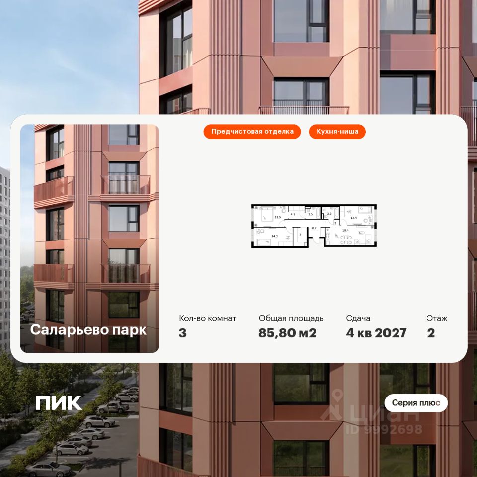 Продаётся 3-комн. квартира площадью 85,8 кв.м на 2 этаже 16 этажного дома (Корпус 57.1, Секция 1) проекта ПИК Саларьево парк. Светлый просторный подъезд на уровне земли, функциональная планировка, большие окна, предчистовая отделка.