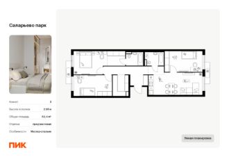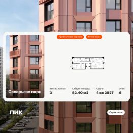 Продаётся 3-комн. квартира площадью 82,4 кв.м на 6 этаже 16 этажного дома (Корпус 57.1, Секция 1) проекта ПИК Саларьево парк. Светлый просторный подъезд на уровне земли, функциональная планировка, большие окна, предчистовая отделка.