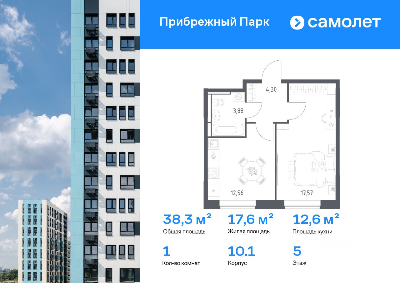 Предлагается 1-комнатная квартира комфорт-класса 38,31 кв.м в корпусе 10.1 на 5 этаже, в ЖК "Прибрежный Парк"