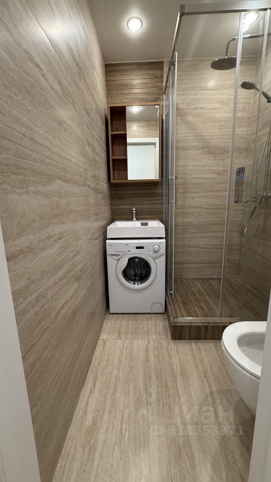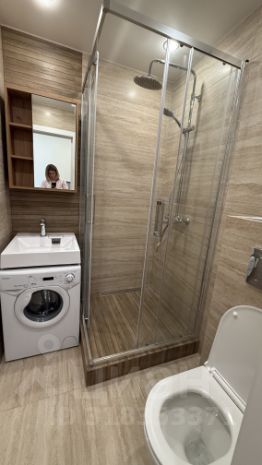 Аккуратный санузел с душевой кабиной. Пол и стены керамогранит.