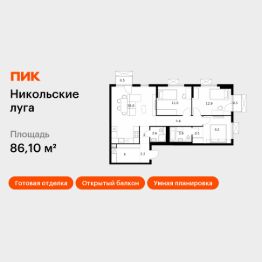 Продаётся 3-комн. квартира площадью 86,1 кв.м на 13 этаже 17 этажного дома (Корпус 4, Секция 6) проекта ПИК Никольские луга. Светлый просторный подъезд на уровне земли, функциональная планировка, большие окна, c отделкой.