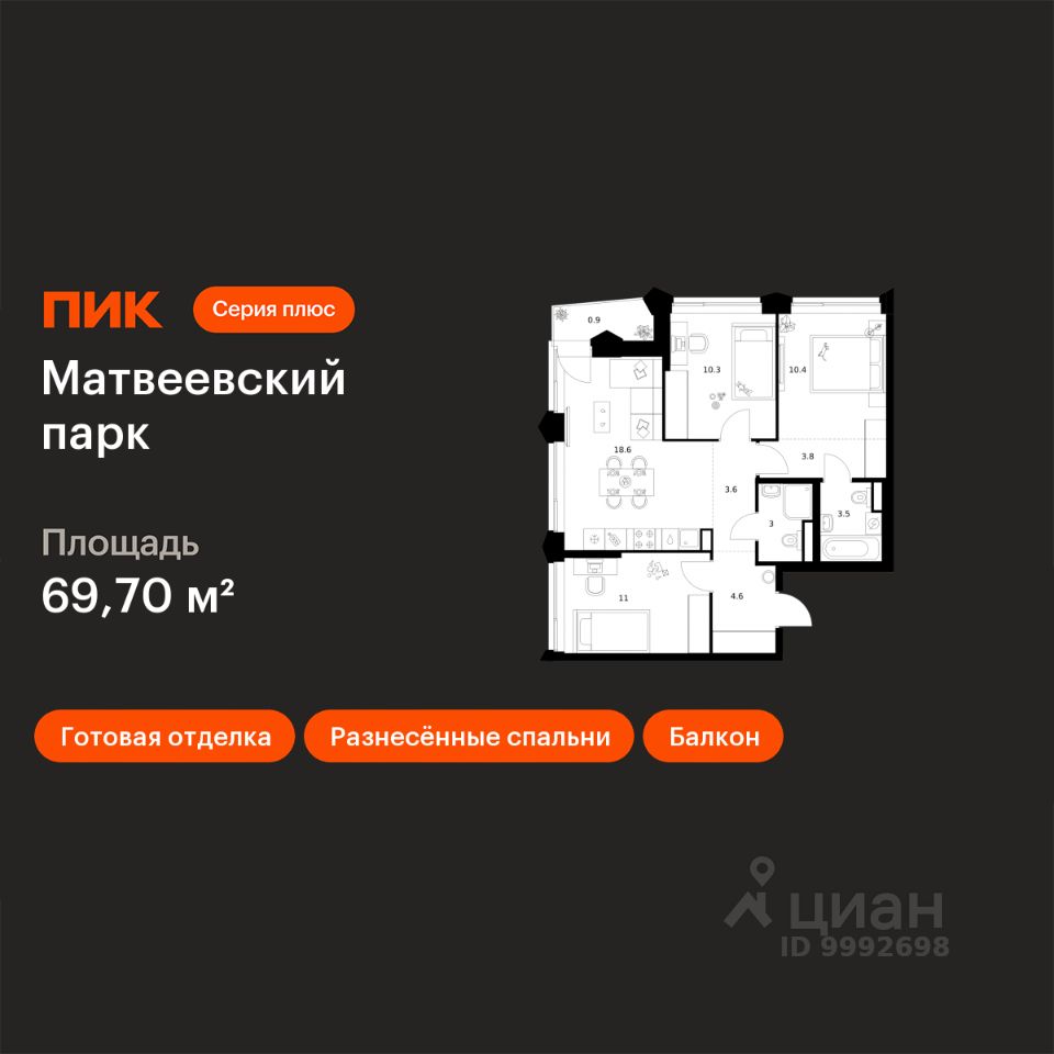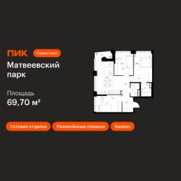 Продаётся 3-комн. квартира площадью 69,7 кв.м на 18 этаже 31 этажного дома (Корпус 4.3, Секция 3) проекта ПИК Матвеевский парк. Светлый просторный подъезд на уровне земли, функциональная планировка, большие окна, c отделкой.