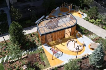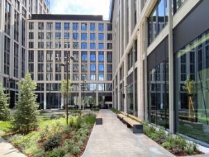 Коммерческие помещения на первых этажах. Благоустроенный двор-парк с фонтаном от бюро Gillespies.