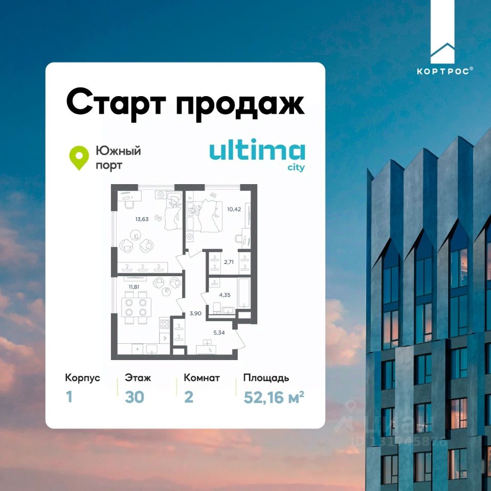 Старт продаж! Продаётся 2-комнатная квартира от застройщика ГК "КОРТРОС" в жилом комплексе бизнес-класса ULTIMAcity. Квартира расположена на 30 этаже 45 этажного корпуса 1. Общая площадь 52,16 м². Без отделки.