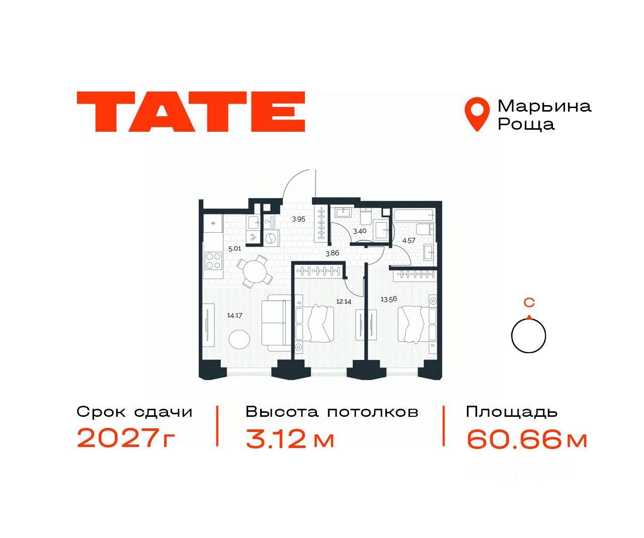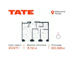 Продаётся 2-комнатная квартира от застройщика в ЖК премиум-класса TATE на 16 этаже. Общая площадь 60,66 м². Отделка предчистовая (white box). Башня В.