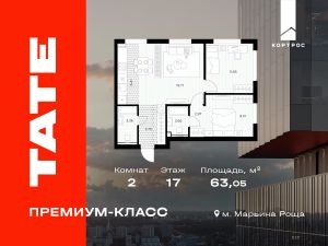 Продаётся 2-комнатная квартира от застройщика в ЖК премиум-класса TATE на 17 этаже. Общая площадь 63,05 м². Отделка предчистовая (white box). Башня В.