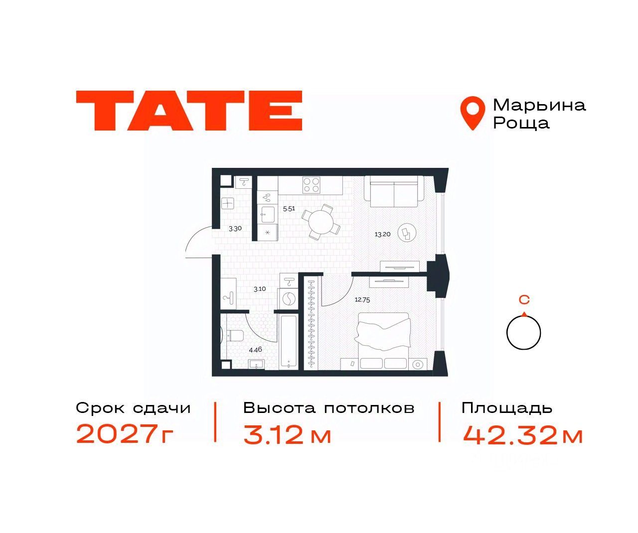 Продаётся 1-комнатная квартира от застройщика в ЖК премиум-класса TATE на 17 этаже. Общая площадь 42,32 м². Отделка предчистовая (white box). Башня В.