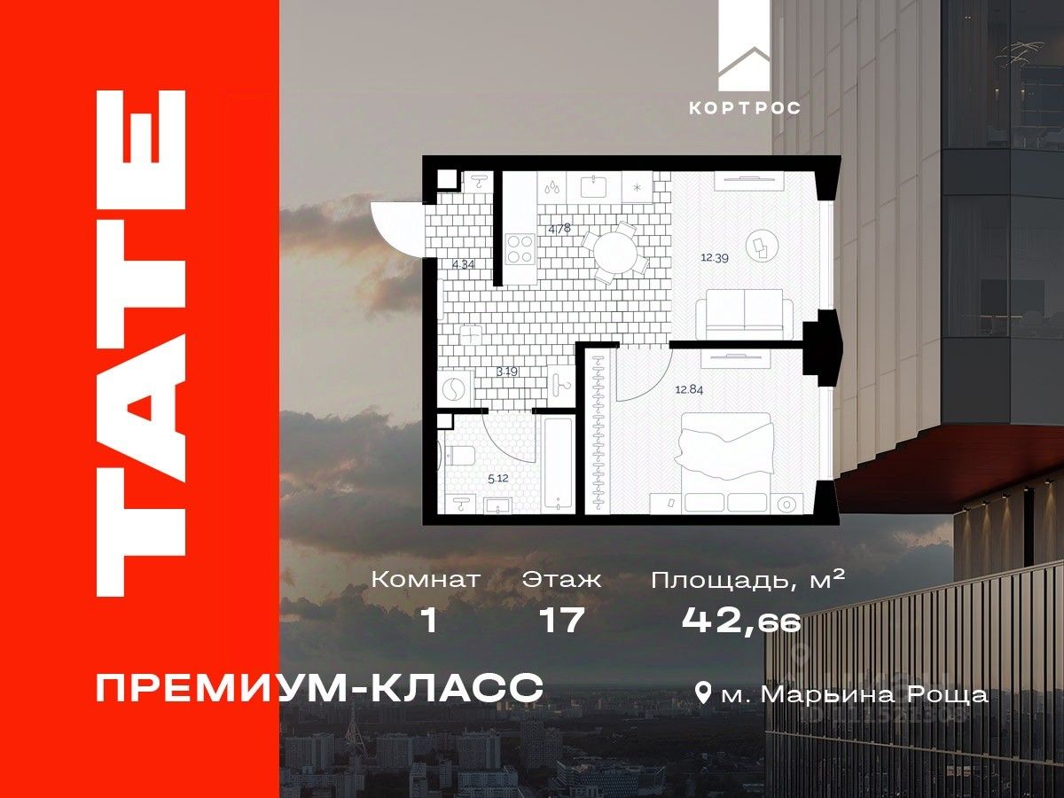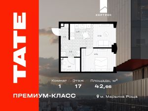 Продаётся 1-комнатная квартира от застройщика в ЖК премиум-класса TATE на 17 этаже. Общая площадь 42,66 м². Отделка предчистовая (white box). Башня В.
