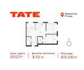 Продаётся 2-комнатная квартира от застройщика в ЖК премиум-класса TATE на 19 этаже. Общая площадь 63,05 м². Отделка предчистовая (white box). Башня В.