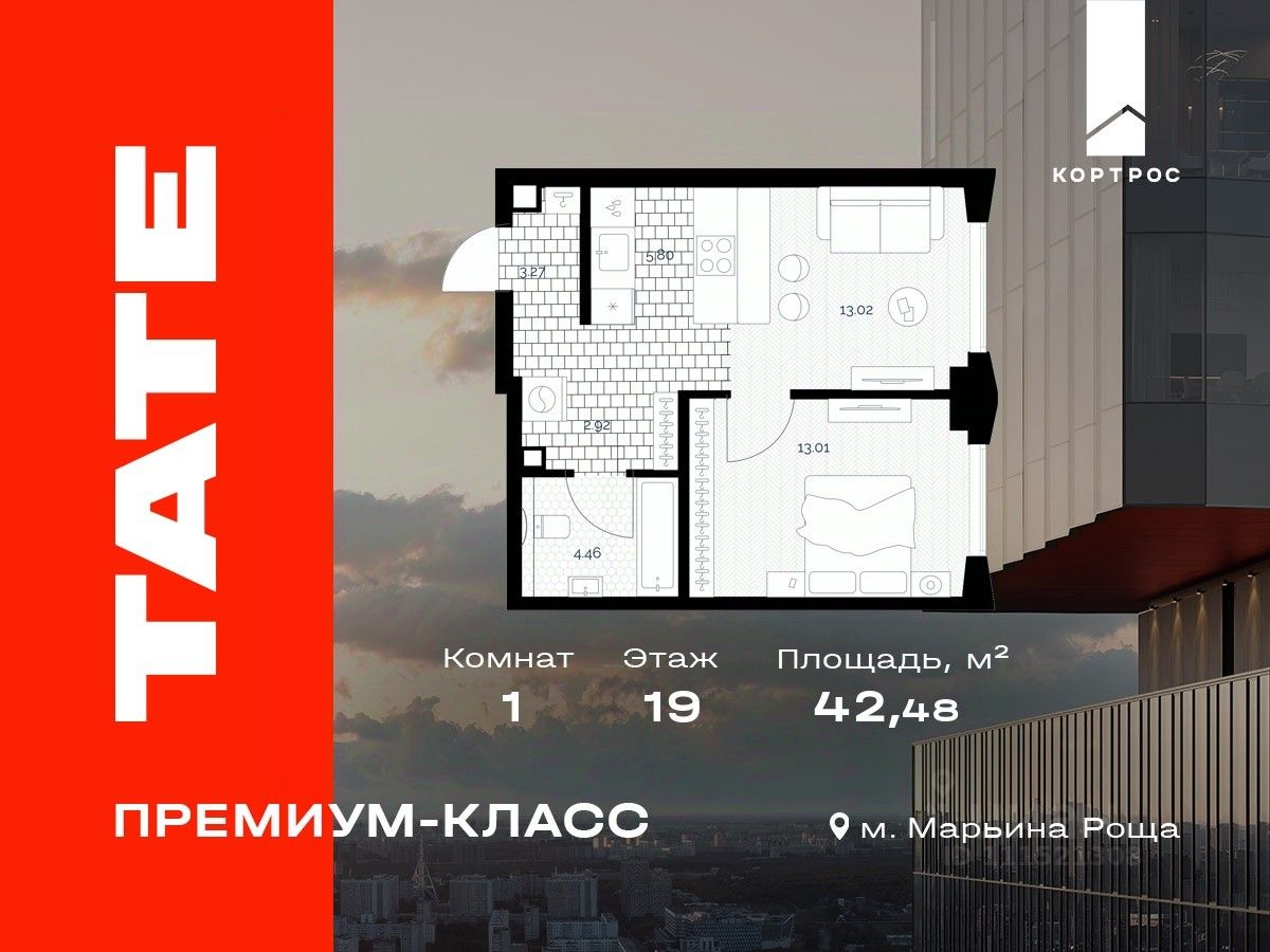 Продаётся 1-комнатная квартира от застройщика в ЖК премиум-класса TATE на 19 этаже. Общая площадь 42,48 м². Отделка предчистовая (white box). Башня В.