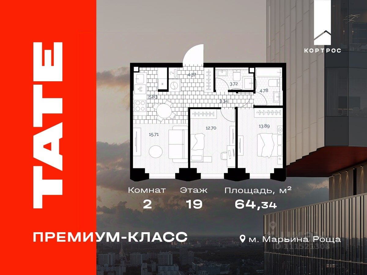 Продаётся 2-комнатная квартира от застройщика в ЖК премиум-класса TATE на 19 этаже. Общая площадь 64,34 м². Отделка предчистовая (white box). Башня В.
