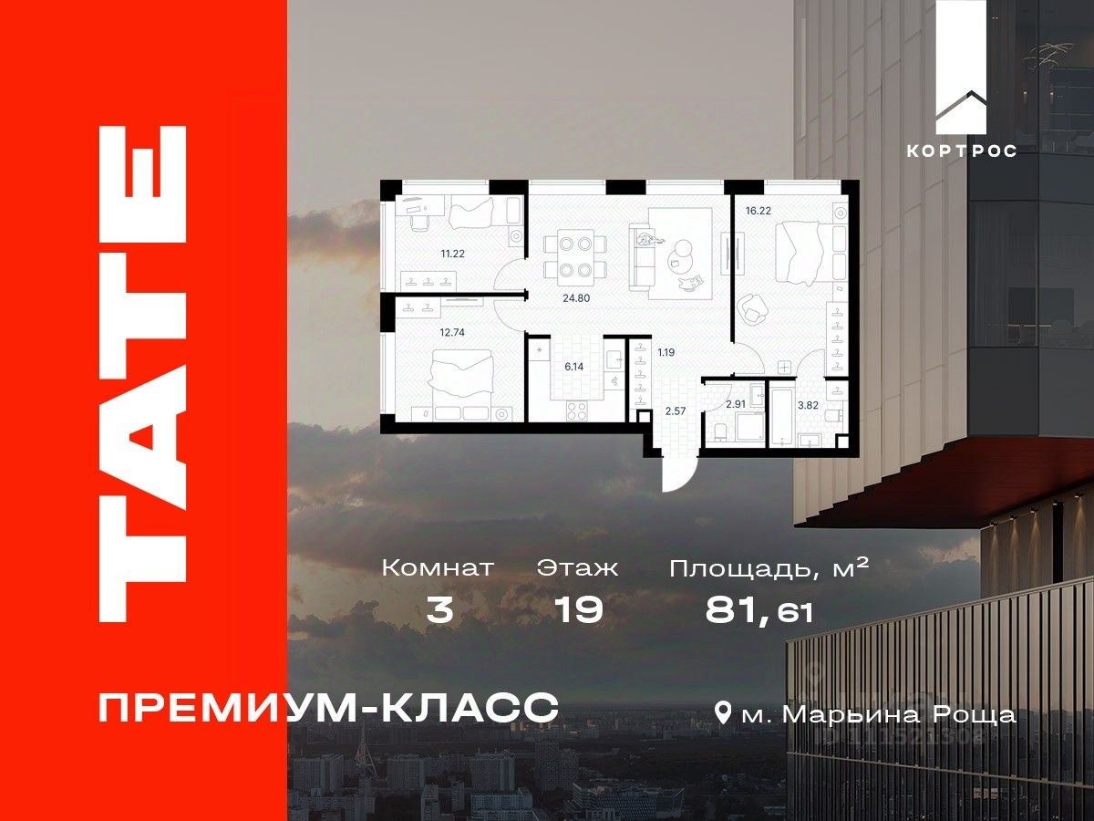 Продаётся 3-комнатная квартира от застройщика в ЖК премиум-класса TATE на 19 этаже. Общая площадь 81,61 м². Отделка предчистовая (white box). Башня В.