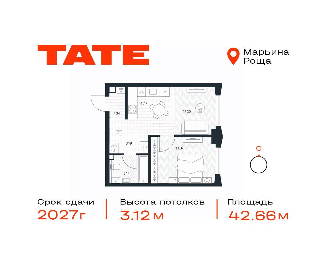 Продаётся 1-комнатная квартира от застройщика в ЖК премиум-класса TATE на 16 этаже. Общая площадь 42,66 м². Отделка предчистовая (white box). Башня В.