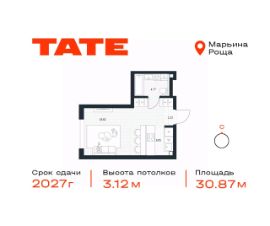 Продаётся квартира-студия от застройщика в ЖК премиум-класса TATE на 20 этаже. Общая площадь 30,87 м². Отделка предчистовая (white box). Башня В.