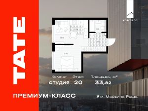 Продаётся квартира-студия от застройщика в ЖК премиум-класса TATE на 20 этаже. Общая площадь 33,82 м². Отделка предчистовая (white box). Башня В.
