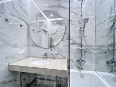 Планировочное решение включает в себя просторную гостиную, уютную спальню со своим санузлом, кабинет (который при желании можно использовать как дополнительную спальню), кухню и отдельный санузел с ванной комнатой. Каждое помещение продумано до мелочей, обеспечивая комфорт и функциональность.