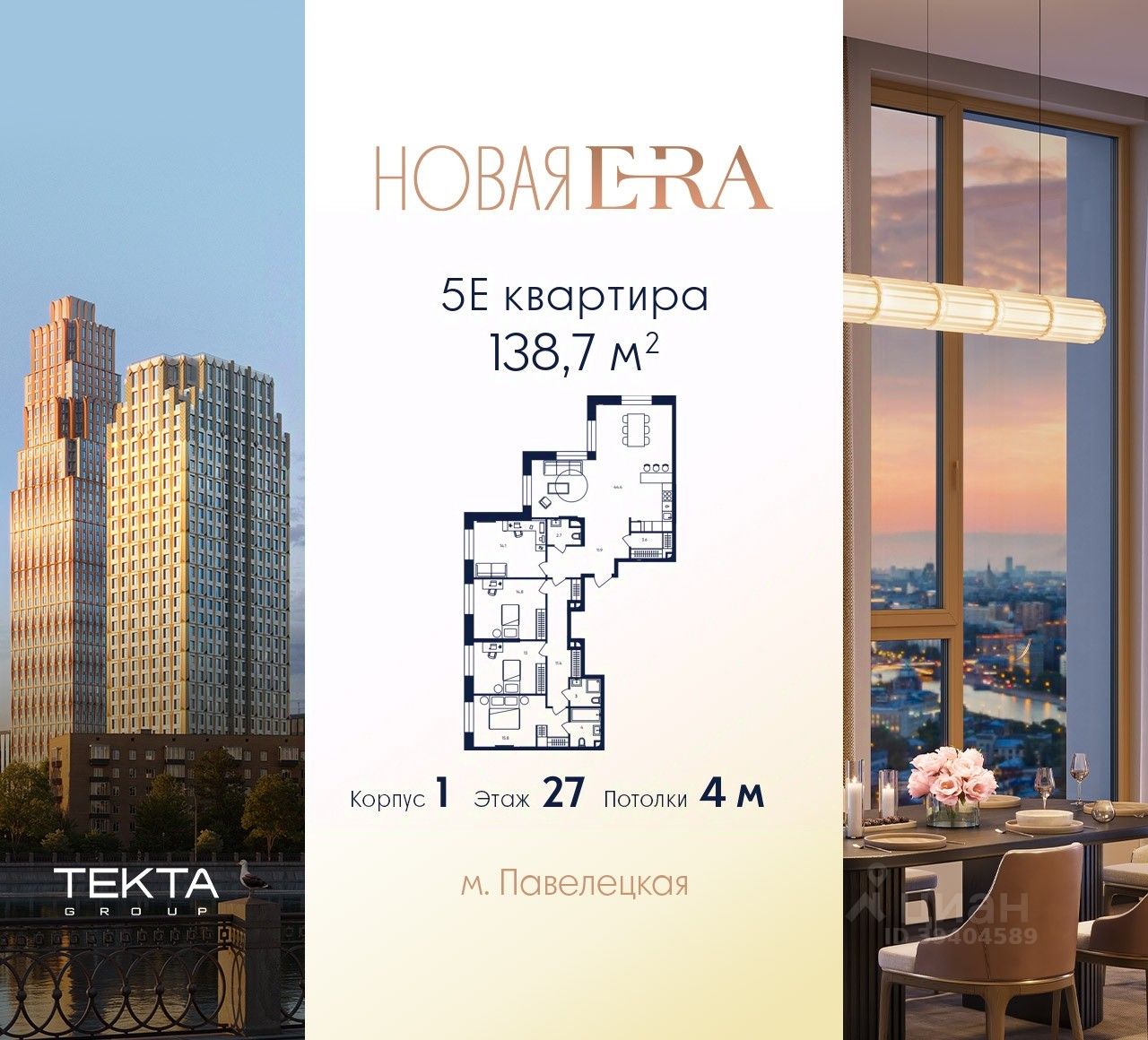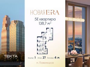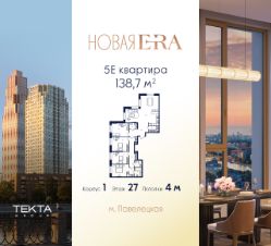 5-комн. квартира в ЖК "Era" на 27 этаже в 27 этажном здании Корпус 1. Общая площадь: 138.7 кв.м., жилая: 97.50 кв.м. Высота потолков 4.00 м.