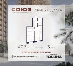 Продаётся 1-комнатная квартира площадью 47.2 м² на 3 этаже в Жилом Комплексе "Союз".