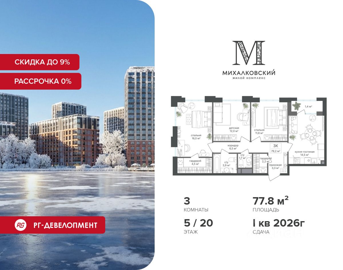 Продаётся 3-к квартира 77,8 кв.м. в ЖК "Михалковский" на 5-м этаже 20 этажного дома.