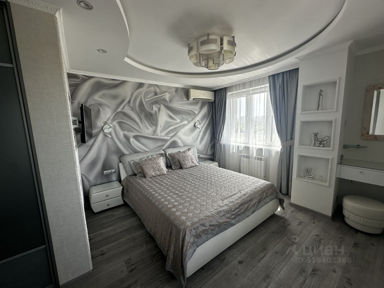 Спальня 1: гардеробная; шкаф; Кровать King size; кондиционер Panasonic; телевизор Panasonic; две регулируемые батареи; цветное освещение; на всех окнах рулонные жалюзи блэкаут, шторы блэкаут и тюль Togas.
