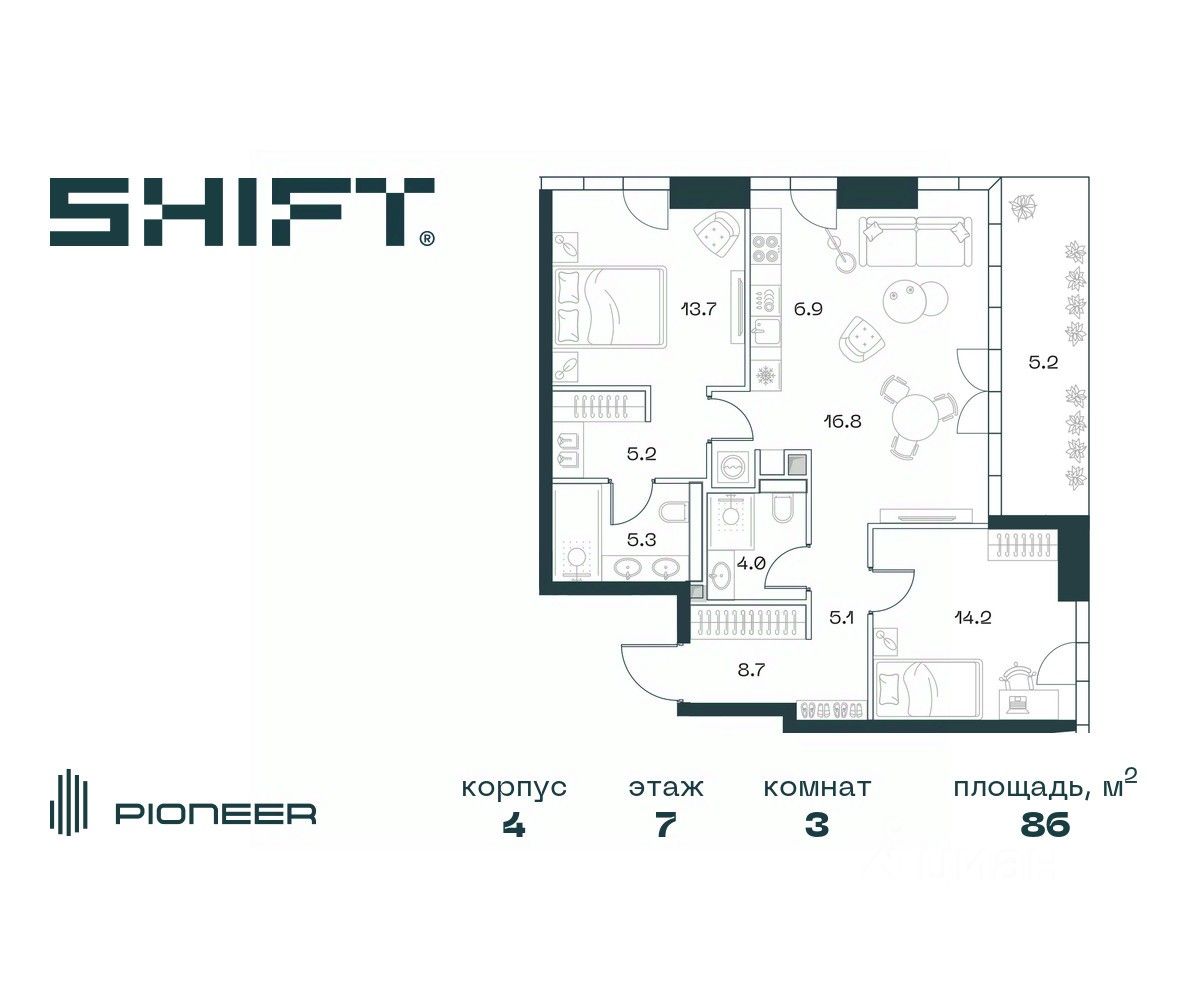 3-к квартира в премиальном комплексе SHIFT на 7-м этаже в 18 этажном здании. Общая площадь 86 кв. м.