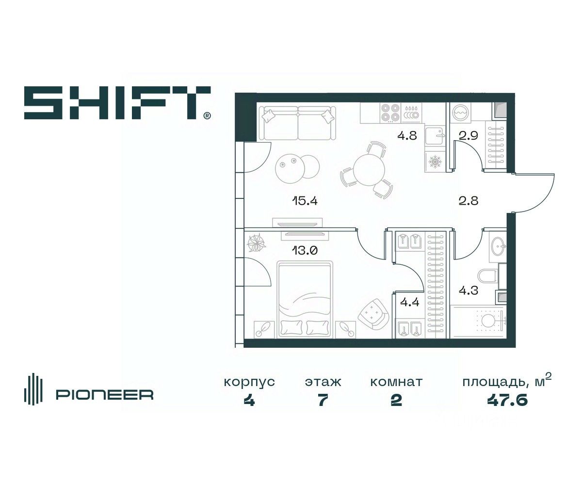2-к квартира в премиальном комплексе SHIFT на 7-м этаже в 18 этажном здании. Общая площадь 47.6 кв. м.
