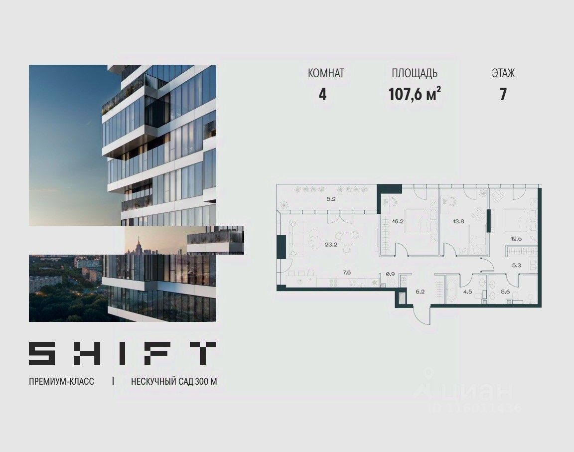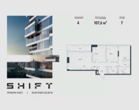4-к квартира в премиальном комплексе SHIFT на 7-м этаже в 18 этажном здании. Общая площадь 107.6 кв. м.