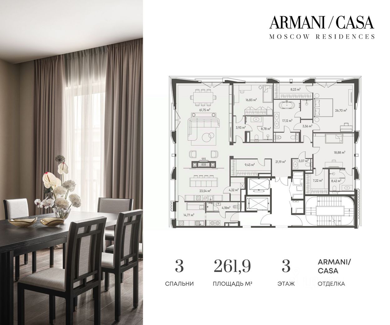 Armani / Casa Moscow Residences — первый и единственный в России проект, созданный в партнерстве с легендарным итальянским домом Armani. Это не просто жилье, а произведение искусства, где каждая деталь отражает безупречный вкус и изысканность итальянского стиля.
