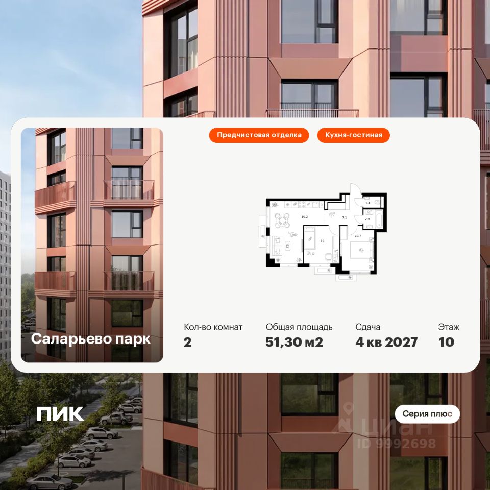 Продаётся 2-комн. квартира площадью 51,3 кв.м на 10 этаже 14 этажного дома (Корпус 57.5, Секция 5) проекта ПИК Саларьево парк. Светлый просторный подъезд на уровне земли, функциональная планировка, большие окна, предчистовая отделка.