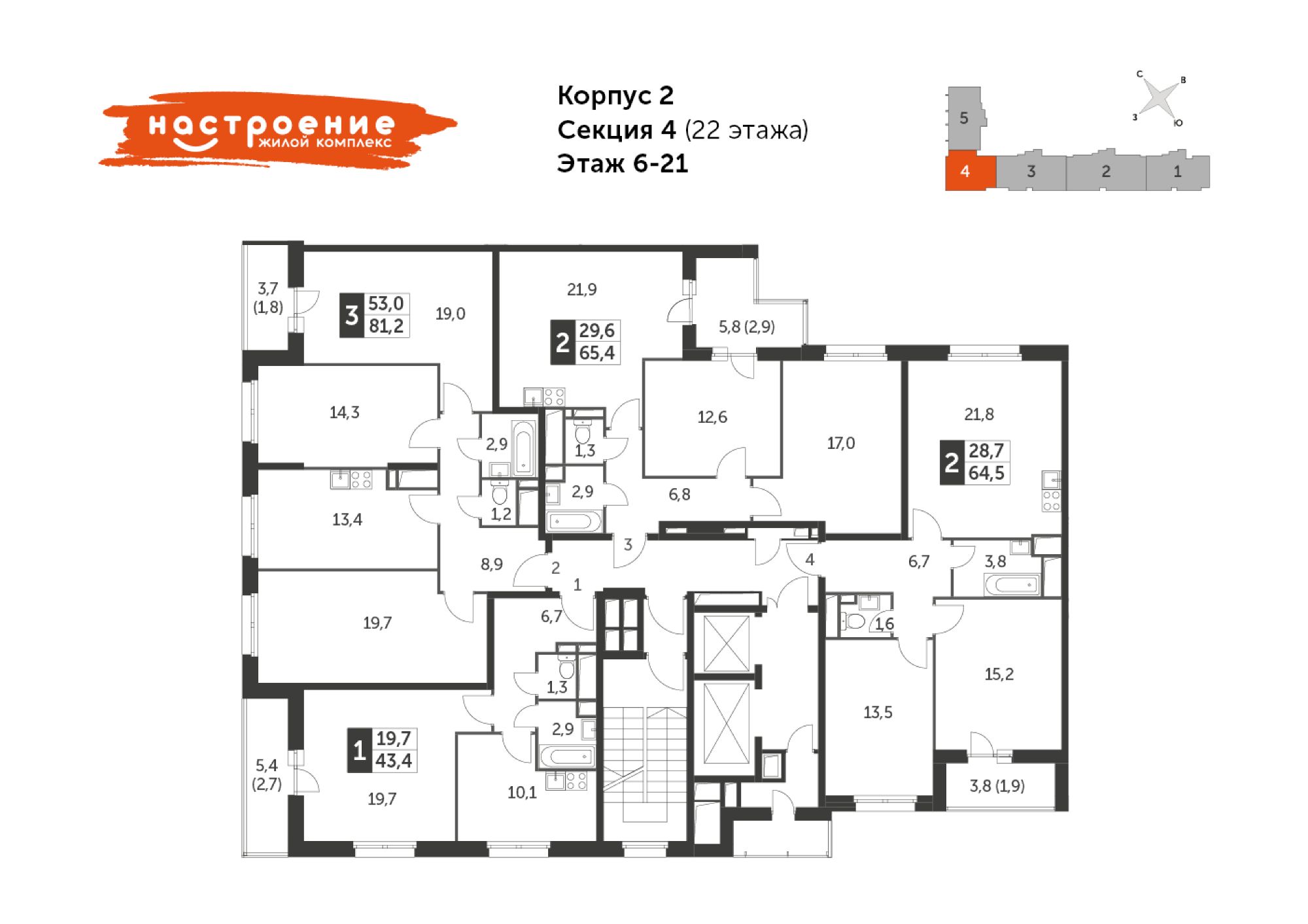 Это жилой комплекс спокойной современной архитектуры, специально спроектированный с переменной этажностью — в его составе четыре корпуса от 8 до 22 этажей. Перепады высотности продуманы так, чтобы обеспечивать жителям верхних этажей вид на парк "Лосиный остров", вход в который начинается всего в 400 метрах от дома "НАСТРОЕНИЕ".