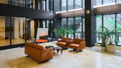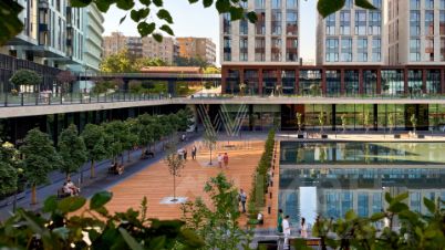 Главное о доме. "Садовые кварталы" — городской ансамбль с собственным парком, бульварами и дворами без машин в Хамовниках. Архитектура держится на светлом камне, крупном остеклении и спокойных вертикалях; разные по высоте корпуса формируют чёткий городской рельеф. Входные группы напоминают лобби хорошей гостиницы: натуральные материалы, высокий потолок, стойки ресепшн и мягкие зоны. На территории работают клубные пространства и семейная инфраструктура, внутри квартала открыт World Class. Вечером дворики читаются камерно благодаря мягкой подсветке. Паркинг под корпусами связан с лобби лифтами.