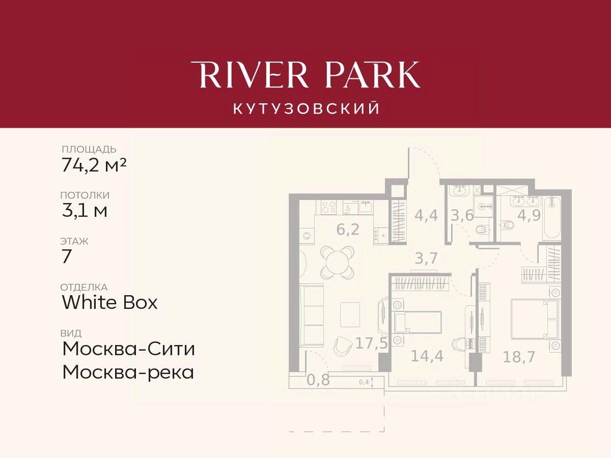 Продается 2-к квартира площадью 74.2 кв.м. на 7-м этаже в жилом комплексе премиум-класса River Park Кутузовский в Башне Emerald Tower