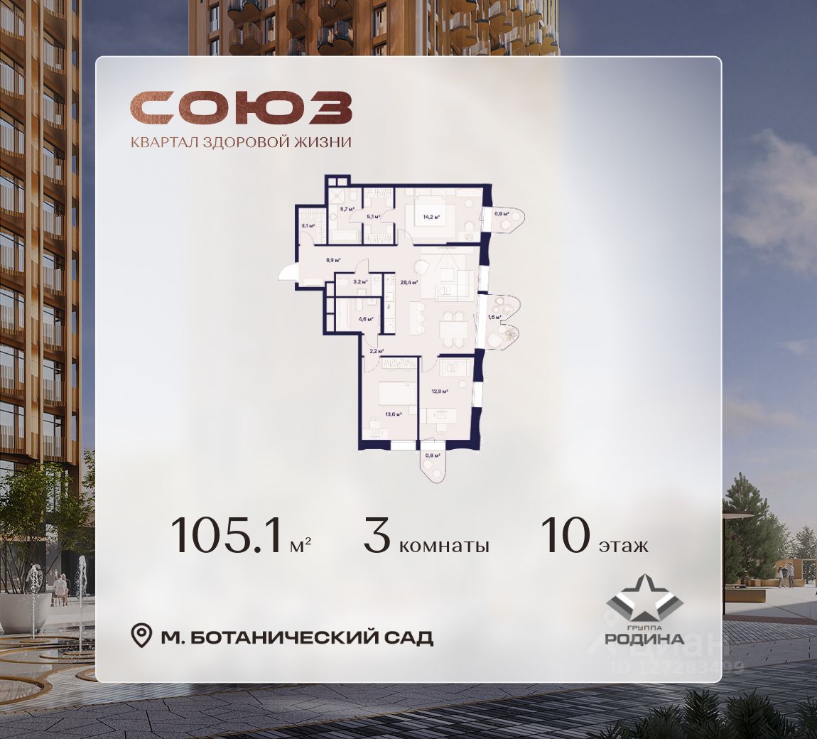 Продаётся 3-комнатная квартира площадью 105.1 м² на 10 этаже в Жилом Комплексе "Союз".
