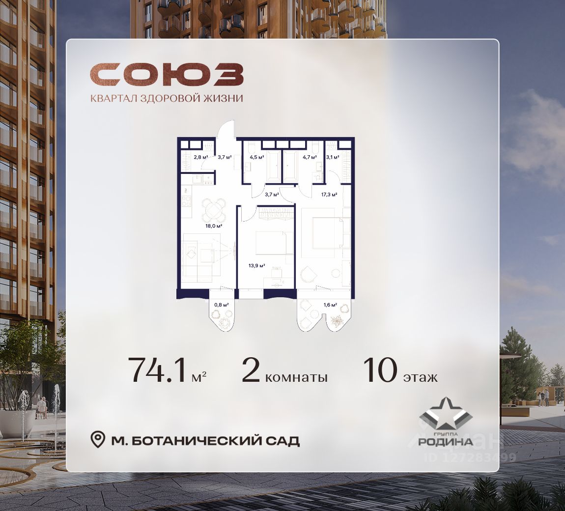Продаётся 2-комнатная квартира площадью 74.1 м² на 10 этаже в Жилом Комплексе "Союз".