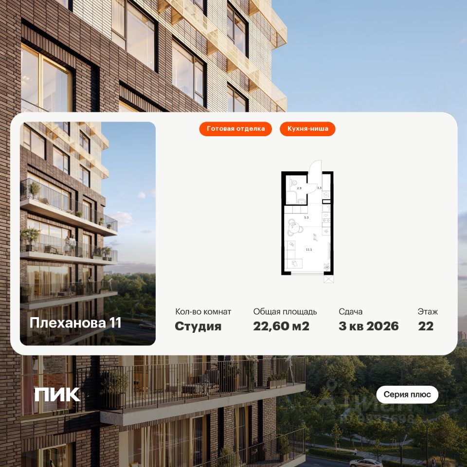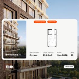 Продаётся квартира-студия площадью 22,6 кв.м на 22 этаже 24 этажного дома (Корпус 1.4, Секция 4) проекта ПИК Плеханова 11. Светлый просторный подъезд на уровне земли, функциональная планировка, большие окна, c отделкой.