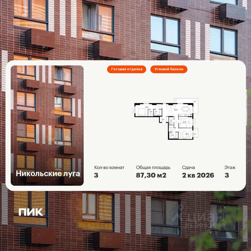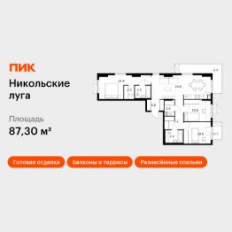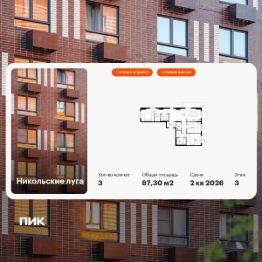 Продаётся 3-комн. квартира площадью 87,3 кв.м на 3 этаже 11 этажного дома (Корпус 4, Секция 1) проекта ПИК Никольские луга. Светлый просторный подъезд на уровне земли, функциональная планировка, большие окна, c отделкой.