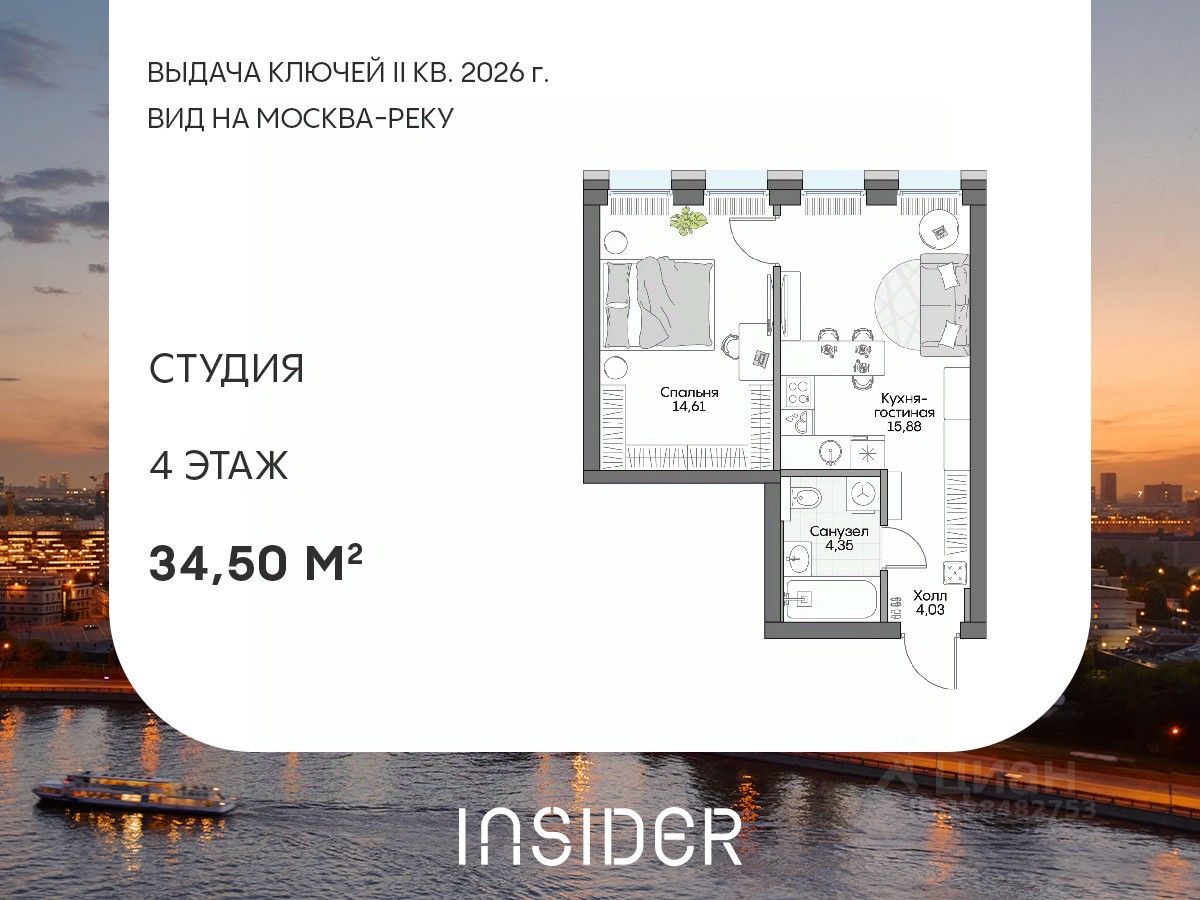 Уютный лот-студия в Доме на набережной INSIDER. Сервисные лоты с системой "умный дом" на первой линии Москвы-реки.