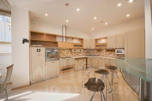 Гостиная 54 кв.м. кухня-столовая 25 кв.м., 2 изолированные спальни. 2,5 сан.узла, 3 балкона, 3 гардеробные комнаты.